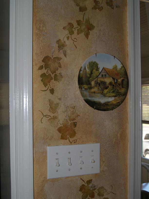 It helps to pick something like an inspiration piece for the room - in this case, the wall was designed around the plate! The glazes were matched with the plate artwork...then stencil art added, and expanded upon with a sand-texture.